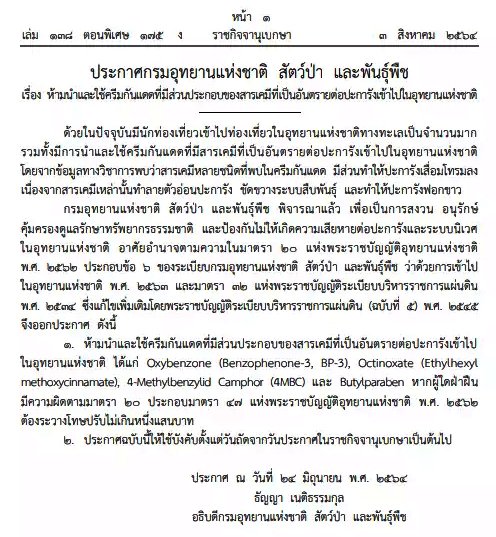 1.ห้ามนำและใช้ครีมกันแดดที่มีส่วนประกอบของสารเคมีที่เป็นอันตรายต่อปะการังเข้าไปในอุทยานแห่งชาติ ได้แก่ Oxybenzone (Benzophenone-3, BP-3), Octinoxate (Ethylhexyl methoxycinnamate), 4-Methylbenzylid Camphor (4MBC) และ Butylparaben หากผู้ใดฝ่าฝืนมีความผิดตามมาตรา 20 ประกอบมาตรา 47 แห่งพระราชบัญญัติอุทยานแห่งชาติ พ.ศ. 2562 ต้องระวางโทษปรับไม่เกินหนึ่งแสนบาท